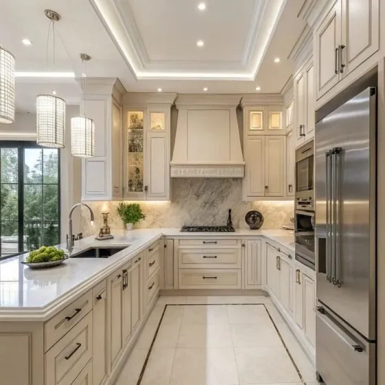 We design, build, and install custom kitchen cabinets Abu Dhabi made with oak, maple, teak, walnut, MDF, and plywood for material options so your kitchen looks neat, feels bigger, and stores more items.